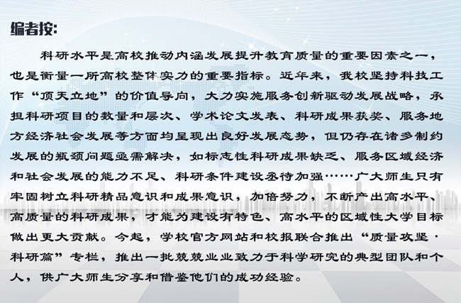 迄今为止,本学科成员中共有正高职称10名,约占成员总数的1/3,比例高于其他各在建学科。此外,过去6年,物理学科共引进11名博士教师,其中4名是海外归国留学人员,现在已有一半以上获得了省级及以上科研项目,逐渐成为学科科研活动的“发动机”和中坚力量。