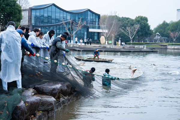 捕鱼时,德清湖边早早围满了师生。起网捕鱼的师生代表与捕鱼师傅们一起慢慢收拢大网,不时有大鱼跃出水面。一条条肥硕的大鱼不断地被捕捞上岸,老师和同学们兴奋地抱起刚刚捕到的大鱼,纷纷进行拍照留念,共同记录这一难忘的欢乐时光,共同享受收获的喜悦。