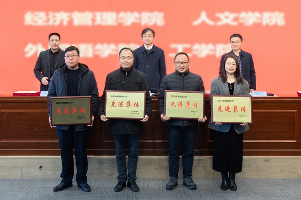 舒志定宣读表彰文件。经济管理学院、人文学院、外国语学院、工学院被评为2024年度招生工作先进集体;教育学院(教师教育学院)、体育学院、生命科学学院、医学院(护理学院)被评为2024年度就业工作先进集体;吴勇辉等18人被评为2024年度招生工作先进个人;李军等41人被评为2024年度就业工作先进个人。