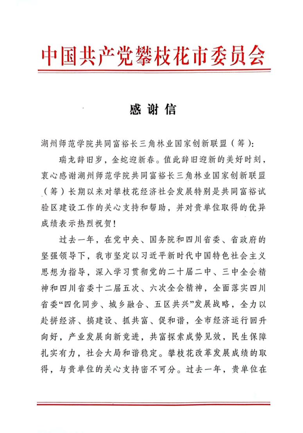 共同富裕长三角林业国家创新联盟(筹)收到四川省攀枝花市感谢信(图)